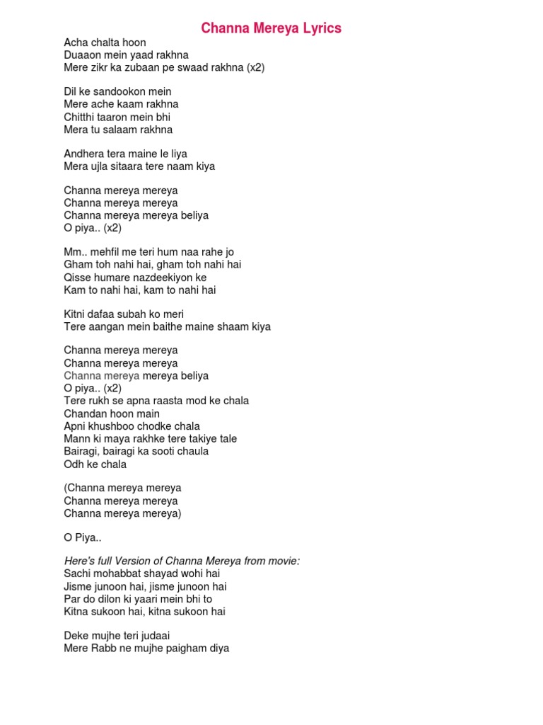 Full Song Channa Mereya Lyrics English / {channa mereya mereya channa mereya mereya channa mereya mereya beliya o piya…} (2). Full Song Channa Mereya Lyrics English / Acha chalta hoon duaaon mein yaad rakhna.